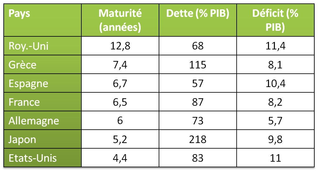Ce qui est donc important, c’est de savoir à quelle échéance, c’est-à-dire à quelle maturité les États doivent rembourser les dettes. Et là, le tableau ci-dessous est édifiant. Les USA – pour ne citer qu’eux – doivent rembourser leur dette dans les 4 ans qui viennent… une durée bien trop faible pour qu’une inflation mesurée et maîtrisée puisse venir l’éroder.